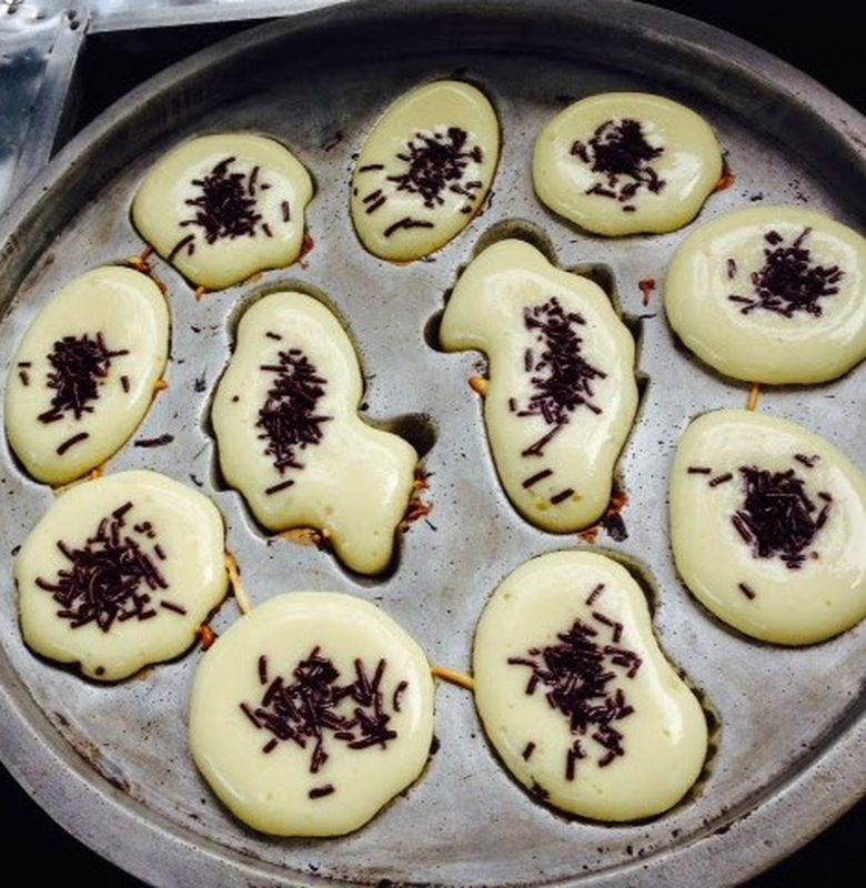 - Tuangkan adonan kue cubit ke dalam cetakan hingga setengah penuh.