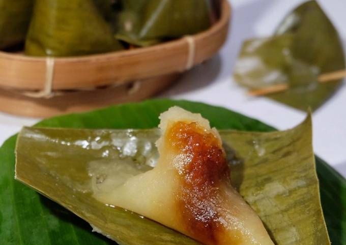 Panaskan sebentar di atas api, sampai daun agak layu, sehingga mudah dibentuk. Gulung sehingga membentuk kerucut. - Isi dengan adonan singkong kira-kira setengah wadah daun. Beri lubang tengahnya dengan jari.